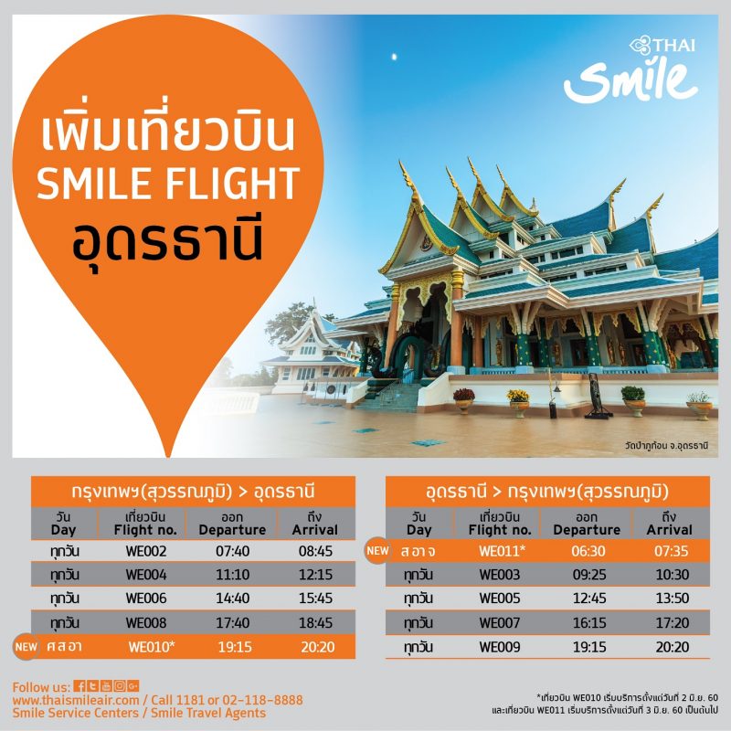 สายการบินไทยสมายล์ เพิ่มความสะดวกสบายให้แก่ผู้โดยสารมากยิ่งขึ้นในเส้นทางกรุงเทพฯ (สุวรรณภูมิ) – อุดรธานี โดยให้บริการ 5 เที่ยวบิน/วัน โดยเที่ยวบินที่เพิ่มขึ้นมาคือ เที่ยวบิน WE010 กรุงเทพฯ(สุวรรณภูมิ)-อุดรธานี ให้บริการในวันศุกร์,เสาร์ และอาทิตย์ เริ่มบินวันที่ 2 มิถุนายน 2560 เป็นต้นไป และเที่ยวบิน WE011 อุดรธานี – กรุงเทพฯ (สุวรรณภูมิ) ให้บริการในวันเสาร์, อาทิตย์ และจันทร์ เริ่มบินวันที่ 3 มิถุนายน 2560 เป็นต้นไป สอบถามรายละเอียดเพิ่มเติมหรือสำรองบัตรโดยสารได้ที่ www.thaismileair.com, Smile Call Center 1181, 02-118-8888 หรือ ศูนย์บริการลูกค้าไทยสมายล์ ณ สนามบินต่างๆ (Smile Service Center) และ ตัวแทนจำหน่ายบัตรโดยสารสายการบินไทยสมายล์ทุกแห่ง
