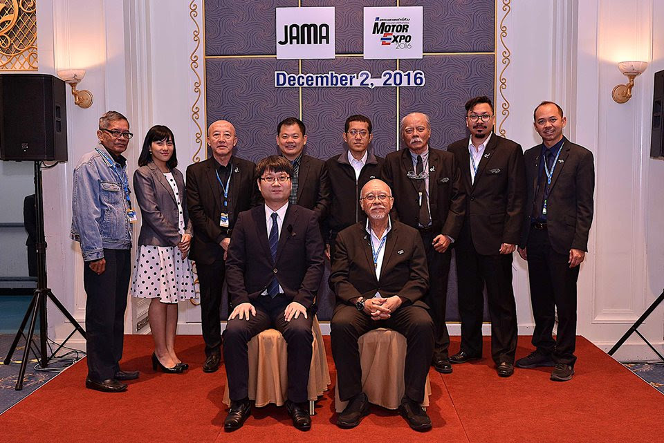 ขวัญชัย ปภัสร์พงษ์ ประธานจัดงาน “มหกรรมยานยนต์ ครั้งที่ 33” ให้การต้อนรับ ทาดาชิ โทยา (นั่งซ้าย) และ โรเบิร์ต โล(ยืนที่ 4 จากซ้าย) ตัวแทนสมาคมผู้ผลิตยานยนต์ญี่ปุ่