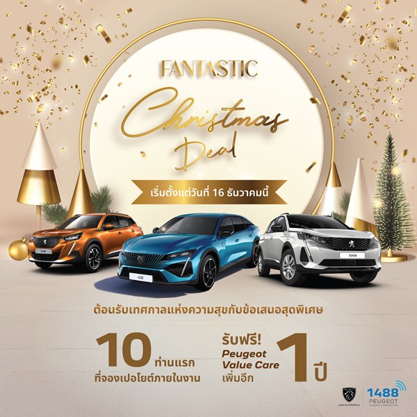 เปอโยต์ ไลอ้อน ออโตโมบิล จัดแคมเปญ ‘Fantastic Christmas Deal’ สัมผัสรุ่นพิเศษ ‘Peugeot DE NOUVEAU’ โค้งสุดท้ายโอกาสเป็นเจ้าของเอสยูวียุโรป ภายใต้ข้อเสนอเร้าใจแห่งปี เริ่มต้น 1.089 ล้านบาท!
