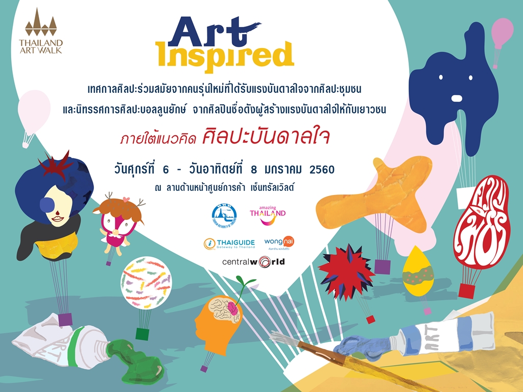 การท่องเที่ยวแห่งประเทศไทย ชวนเที่ยว-ชม-ช้อป-ชิม-ชิล ในงาน “Art Inspired ศิลปะบันดาลใจ” งานศิลปะบนบอลลูนยักษ์ ขนาดใหญ่ถึง 10 เมตร ที่มี 9 ศิลปินชื่อดังหลายสาขามาร่วมกันออกแบบ ได้แก่ คุณดวงฤทธิ์ บุนนาค – สถาปนิกและนักออกแบบชื่อดัง คุณคูณคลัง เค้าภูไทย-กราฟิกดีไซเนอร์และผู้กำกับเอ็มวีชื่อดัง คุณกงพัฒน์ ศักดาพิทักษ์ – ศิลปินแนวโมเดิร์นอาร์ตและป๊อปอาร์ต คุณทวีศักดิ์ ศรีทองดี –นักวาดภาพประกอบชื่อดัง คุณพงศกร อารีศิริไพศาล-นักออกแบบ และนักถ่ายภาพ คุณ Michael Paul Young-นักออกแบบกราฟฟิก และโปรแกรมเมอร์รางวัลระดับโลก คุณสมรรถชัย บุญศักดิ์-ผู้กำกับภาพยนตร์โฆษณาชื่อดัง คุณฟ้าวลัย ศิริสมพล-นักวาดภาพประกอบชื่อดัง และ คุณพิรญาณ์ นุชอำพันธุ์ –ศิลปินรุ่นใหม่นักออกแบบคาแรคเตอร์