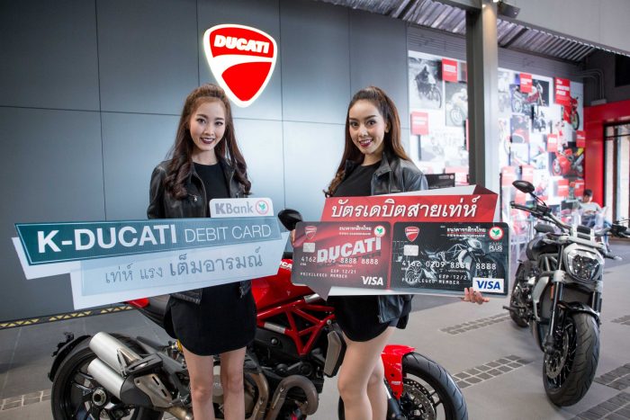 ธนาคารกสิกรไทย จับมือดูคาติไทยแลนด์ ตอบรับกระแสชื่นชอบบิ๊กไบค์สัญชาติอิตาลี ออกบัตรเดบิตกสิกรไทยลายดูคาติ (K-Ducati Debit Card) ลายใหม่ 2 ลายที่มีหน้าบัตรเป็นมอเตอร์ไซค์แห่งดีไซน์ นวัตกรรม และสัญลักษณ์ของความเท่ห์ ระดับโลก ได้แก่ K-Max Plus Ducati Debit Card มีดีไซน์หน้าบัตรเป็นบิ๊กไบค์ดูคาติ รุ่นเอ็กซ์ แดเวล (Ducati XDiavel) และ K-My Ducati Debit Card กับดีไซน์หน้าบัตรเป็นบิ๊กไบค์ตระกูลมอนสเตอร์ (Monster) พร้อมด้วยสิทธิประโยชน์สุดเอ็กซ์คลูซีฟจากดูคาติไทยแลนด์ อาทิ ทดลองขับขี่ดูคาติฟรีที่โชว์รูมทุกสาขา โดยมีเงื่อนไขตามที่โชว์รูมกำหนด รับส่วนลดสินค้าในร้านจำหน่ายสินค้าที่ระลึกดูคาติ สิทธิพิเศษใช้ห้องรับรองพิเศษที่โชว์รูมทุกสาขา เป็นต้น และยังได้รับส่วนลด สิทธิพิเศษอื่นๆ อีกมากมายจากธนาคารกสิกรไทย