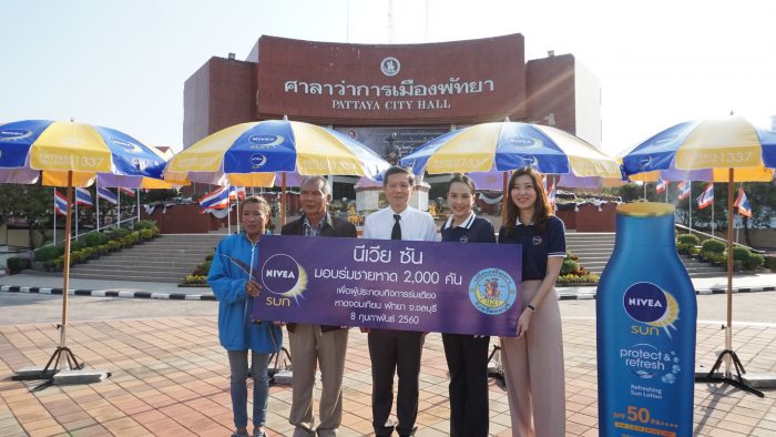 นีเวีย ซัน ผู้เชี่ยวชาญเรื่องผลิตภัณฑ์ปกป้องแสงแดดอันดับ 1 ของโลก โดย ชวีนา จิตรสมบูรณ์ (ที่สองจากขวา) ผู้จัดการฝ่ายการตลาด ผลิตภัณฑ์บำรุงผิวนีเวียซัน ห่วงใยสุขภาพผิวของคนไทย มอบร่มชายหาดจำนวน 2,000 คันแก่เทศบาลเมืองพัทยา โดยมี ชนัฐพงศ์ ศรีวิเศษ (กลาง) ปลัดเมืองพัทยา รักษาการนายกเมืองพัทยา และ ประดิษฐ์ หอมชื่น (ที่สองจากซ้าย) ประธานชมรมผู้ประกอบกิจการร่มเตียงชายหาดจอมเทียน เป็นผู้รับมอบ เพื่อนำไปติดตั้งบริเวณชายหาด ช่วยปกป้องผิวนักท่องเที่ยวชาวไทยและช่าวต่างชาติให้ปลอดภัยจากแสงแดด พร้อมหวังเป็นส่วนหนึ่งในการสร้างความสวยงามและความเป็นระเบียบของหาดเพื่อเป็นความทรงจำที่ดีให้กับนักท่องเที่ยวทุกคน ณ ศาลาว่าการเมืองพัทยา เมื่อเร็วๆนี้